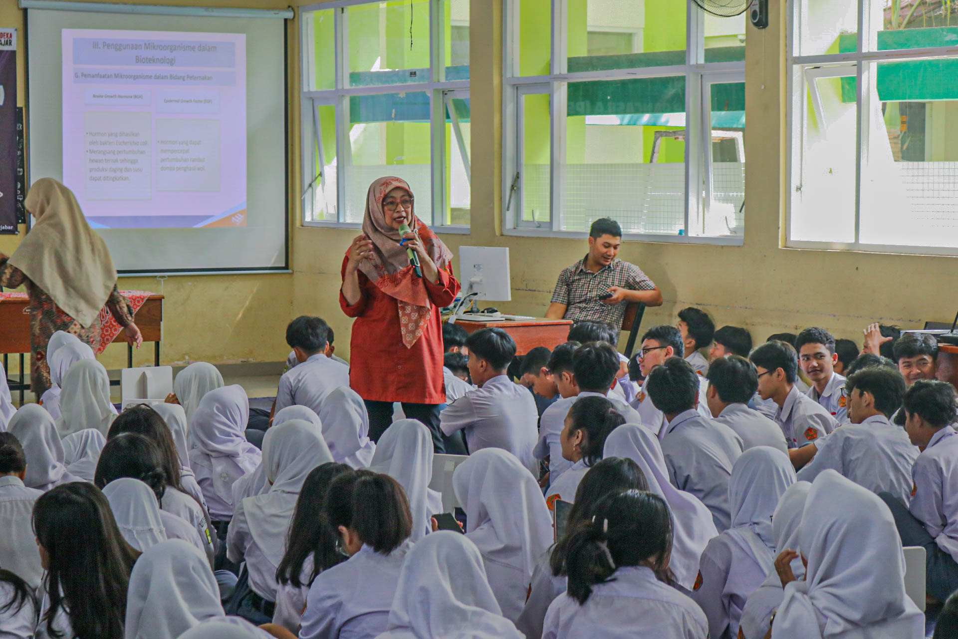 Kegiatan inti hari kedua ini melibatkan proses mengidentifikasi informasi dan gagasan relevan serta menganalisisnya untuk menemukan kesimpulan tentang berbagai materi yang disampaikan. Materi pertama mengenai Rekayasa Teknologi bidang Kimia disampaikan oleh Ibu Ami Siti Maryam, S.Pd., M.M., yang membahas tentang aplikasi teknologi dalam pengembangan produk kimia. Materi kedua tentang Rekayasa Teknologi bidang Informatika dipaparkan oleh Bapak Ardi Ajang Kusnadi, S.T., dengan fokus pada inovasi digital dan pemrograman. Selanjutnya, Bapak Saepudin, S.Si., menyajikan materi ketiga mengenai Rekayasa Teknologi bidang Fisika, mengajak siswa untuk memahami penerapan prinsip fisika dalam teknologi. Terakhir, Ibu Hj. Ita Nursinta, S.Pd., menyampaikan materi keempat tentang Rekayasa Teknologi bidang Biologi, yang menyoroti penggunaan teknologi dalam penelitian dan pengembangan biologi.